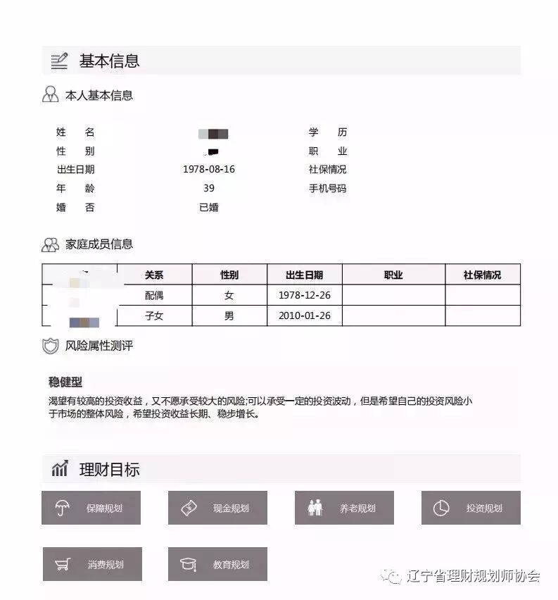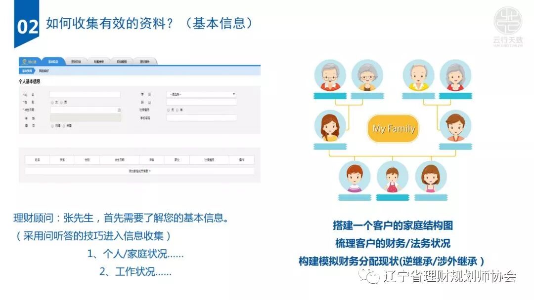 首先,我们会在这个系统里,录入我们的家庭的基本信息,然后做一个简单的风险属性测评,最后,我们会通过资产负债表、现金流量表、保单检视表三个表格,得出八大比率分析体现客户的增值能力、偿债能力、应急能力、结余能力与保障能力五大能力的综合表现,再分别帮助客户梳理理财目标,并一起去开展下一步的理财目标规划。 那在这个系统里面,并没有提及到税收筹划。在理财规划的课程里有八大规划,但是在这个系统里面是只有七项。 因为税收筹划它涉及的范围是比较多、比较广,不同的地域会有不一样的法律法规,因此在这个系统里没有涉及到这一块的内容。 讲到现在,大家还是会有一点懵懂,那么,我会在下面会具体实际的工作操作中,给大家讲解一下。 我相信我们在展业的过程中,不管是过去还是现在,只要是以客户需求为导向的销售,我们都要从了解客户的基本信息为前提开始。 那这样,一个工具的前期是一个基本信息录入,也就是:当我们开始了解客户的家庭情况,借用FNA的基础信息收集去梳理客户的家庭的成员结构,继而梳理客户家庭法务、税务的关系。