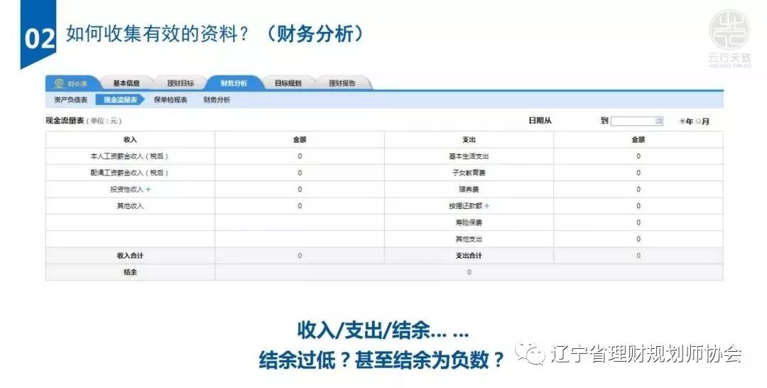 企业资产负债,他主要是反映企业有多少资产,资产属性类别是什么,企业有哪些负债,然后净资产有多少,他的构成,他主要体现企业的财务结构和状况。 那第二个,是企业现金流量表。那现金流量表是体现企业在一段时间内流入流出的资产状态,现金流入流出的一个原因。 我们知道在理财方面,我们是在在理一生之财,控制的是我们一生的现金的流入流出,做到收支平衡的一个状态,所以其实是相同的一个概念。 那也会体现企业的一个偿债能力和支付能力以及未来获取现金的一个能力,在投资和理财活动中产生的成果体现,包括财务状况的影响以及其他的许多方面。 当在这一块的沟通完毕后,尤其是在保密协议的作用下,客户还是非常愿意配合去做财务数据收集的。 透过现金流量表,可以获取客户的有效信息,比如说客户的收入状态、支出状态以及全年的结余比的结余状态,在这个过程当中,也会发现很多“高产能”客户实际上结余过低,甚至结余为负数。 在资产负债表的净资产里,我们甚至还会看到:很多的负翁,但这个负啊,是负数的负,不是富有的富!那通过这些数据可以去挖掘客户背后,哪个板块存在一些潜在的风险。