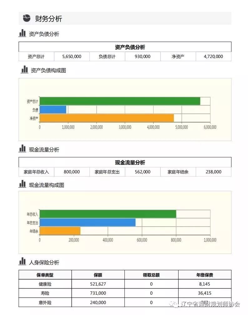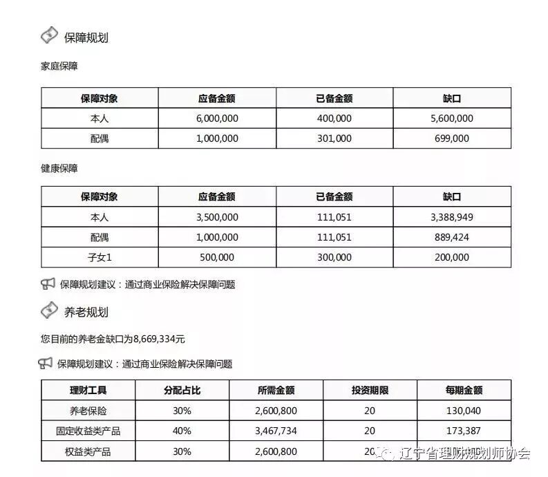然后到了我们比较熟悉的一个保障规划这个板块儿了。 我们通过我们前面的数据收集 我们可以看到,客户本人他是每年六十万的这样的一个收入。那也就是说我们对应的一个家庭保障 如果是十倍的年收入的这样的一个应备金额的话,需要被配备六百万的一个家庭保障。而他目前配备的是只有四十万的一个家庭保障,所以在缺口方面啊,还是非常大的去到五百六十万。 配偶,她的年收入是十万。所以呢,她应备的一个家庭保障的额度去到一百万。那她已经被配备了一个三十万,还有将近七十万的一个缺口。 我们通过下面的健康保障的这样一个表格,看到了我们应备的一个健康保障和我们一倍的一个金额。 我们可以通过这个表格看到这一个客户本人和偶他们在重疾或者说在健康这一块每人只有十多万的这样的一个配备。那孩子是去到了一个三十万的一个配备,所以是非常不合理,也是不够科学的。 因为当这样的一个配置方案在这样一个家庭里面对男人来说是起不到太大的作用的,所以是得不到客户对保险这个金融工具的认可。 那我们现在更多的是要去思考我们采用什么样子的一个方案,或者是说产品组合能够去满足客户怎样的一个缺口。那这样一个金融工具,实实在在的可以在他家里面家庭发生风险的时候,能够起到它应有的功能跟效用。 今天的分享里面呢,我并不会把本公司的一些产品罗列进去或者说把这种计划组合放进去。我只是想给大家传递一种观念,就是通过数据分析,别看这些数据看起来是冷冰冰的,但是背后有它的温度在。然后通过这样的一个方式让更多的客户了解到保险这个金融工具,在家庭财务安排当中的不可替代性。 而且他是一个非常科学合理的一个金融工具,如果运用得当的话,是可以帮助客户守住自己的财富,然后完善财富的一些安全系统,帮助我们客户去实现财务的自由的。 好,然后我们看到接下来的是养老规划,养老规划在这个沟通的前提下,其实我们是有一个表格的还是会问到客户他希望在什么样子的一个节点退休。他希望得到这样的一个养老年限大概是去到多少,然后这样的通胀,目前我们看到的一个通胀比率是多少,然后这样子倒推到现在,我们应该做什么样子的一个准备以及对我们的养老做什么样子的一个期许和安排。 目前这个客户他所需的这个养老金的缺口是有八百多万,那是不是意味着客户的所有的缺口都要通过保险内的这种产品或者说年金型的产品来解决呢,也未必。 那我们注意理财规划师,我们的角度还是需要中立的。所以在整个理财工具的选择上。我们分了三个别别类,一个是养老保险的一个别类,还有个是固定收益类的一些产品或者是权益类的一些产品,所以在资产负债表的罗列里面,要帮客户去梳理它的一些资产属性属于什么样子的资产属性,未来,可以帮他解决哪个方面的一些规划和安排。 当然,系统里面还会去把我们已备的社会保险,我们可以替代的养老金、甚至我们可以去替代的保障、以及我们的健康、规划这些数据,去做一个统筹,就是在整个的报告呈现里面是比较充分和合理的,因为我们在资产负债表跟现金流量表的这两个表格里面,会把整个家庭的很多的资产属性全部罗列出来,然后能够真正的帮助客户去梳理财务上的一些和保单的一些状态。