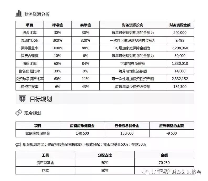 那第一项是现金规划。在现金规划上客户的一倍资金是十五万。那根据他的家庭的收入这样一个状态,每一月的生活开支也就是必备开支,他的应对资金是十万多。 所以在这个储备上,可以去规划的一个现金流就有九千多可以去做一个安排或者说规划。 在做目标规划的时候每一个规划背后,他的每一个逻辑关系或者是说帮客户解决什么样的问题,在这个跟客户的交流当中,是要去具体的去梳理的。