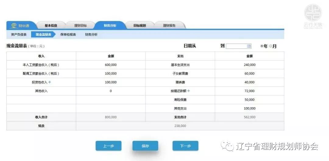 我们可以看到他的资产负债表的一个状态。这个客户的流动性资产并不多,只有十五万。 我们可以看到他的投资性资产,起初只值三十五万,然后目前的市值是五十万。 在投资性资产板块儿里面,其实我们有涵盖有很多包括基金、股票,然后甚至是投资性房产,都会放在里面。 还有他的自用性资产是去到了五百万,属于特殊性质产,比如说他的社保,保险那个资产,我们会放在特殊性资产里面,还有其他的一些资产。 在负债这一块,他的信用卡的透支额度是三万,然后房贷是未完全还清的房贷本金是八十万,然后还有一些其他的负债是十万。 这些其他的负债额,基本是他在外面的一个借款的一个状态,当然还有一些客户,在其他负债里面,他会有负数的体现,那他负数的体现是什么呢? 负数的体现,是指别人借他的钱未归还的状态,我们放在负债里面。 通过这个表格,我们可以看到他全年的他的负债的合计是九十三万。然后他的资产合计是五百六十五万。那净资产的状态是七百七十二万。那我们可以看到他整个净资产的比率,自用型资产是占了很大额度。 接下来是现金流量表。