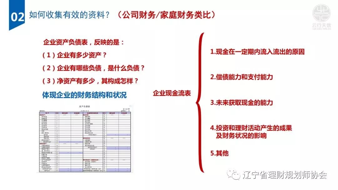 第一个表格是资产负债表,我们要去知道每个数据背后的逻辑是什么。 因为每一个资产属性背后,它反映的是什么,它属于哪个板块的资产,这些都是我们要去认知的。 但,往往这个时候,客户不能理解,也不希望提供自己过多的隐私数据给到我们。 那这个时候,我会跟客户进行一个深度的交流。 为什么要提供这样详细的数据去做财务分析呢?是为了更好地提供一个量身定做财务报告和一个合理配置的方案给他。 我会结合客户的背景,例如:他是企业主或者财务人员、企业的中高层管理人员。 他们都非常明白企业资产负债表和企业现金流量表对企业运作的参考意义,我会建议他把自己的家庭财务类比企业财务进行管理和分析。 那在这一块,我就简单的跟大家分析一下或者介绍一下企业的资产负债表它的功能和用意是什么。