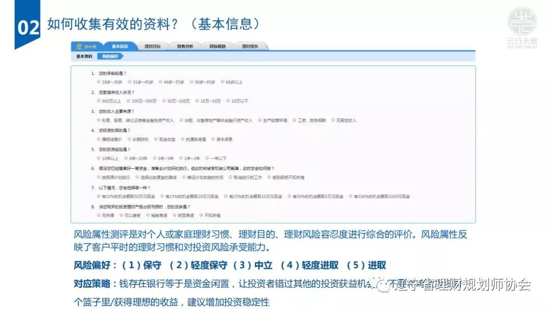 我相信,类似这样一个风险测试表,大家并不陌生,在很多金融机构都可以看到过。 那么风险属性测评是对个人或家庭理财习惯、理财目标、理财风险容忍度进行综合摸底的一个工具。 风险属性反映的是客户平时理财习惯和对投资风险承担的能力,在理财规划里,我们通过成长性资产或者是定向性资产的占比来判断他们的风险偏好、投资偏好。 当判定他们的风险偏好后,心里对这个客户有了一个大致的了解。 接下来,就是对客户进行理财目标一个排序。 引导客户说出自己的顾虑,当然,理财不单是单一的投资方面的一个行为,理财是一个综合行为,并已经涉及到我们生活的方方面面,首先要告诉客户,真正的理财规划是什么。